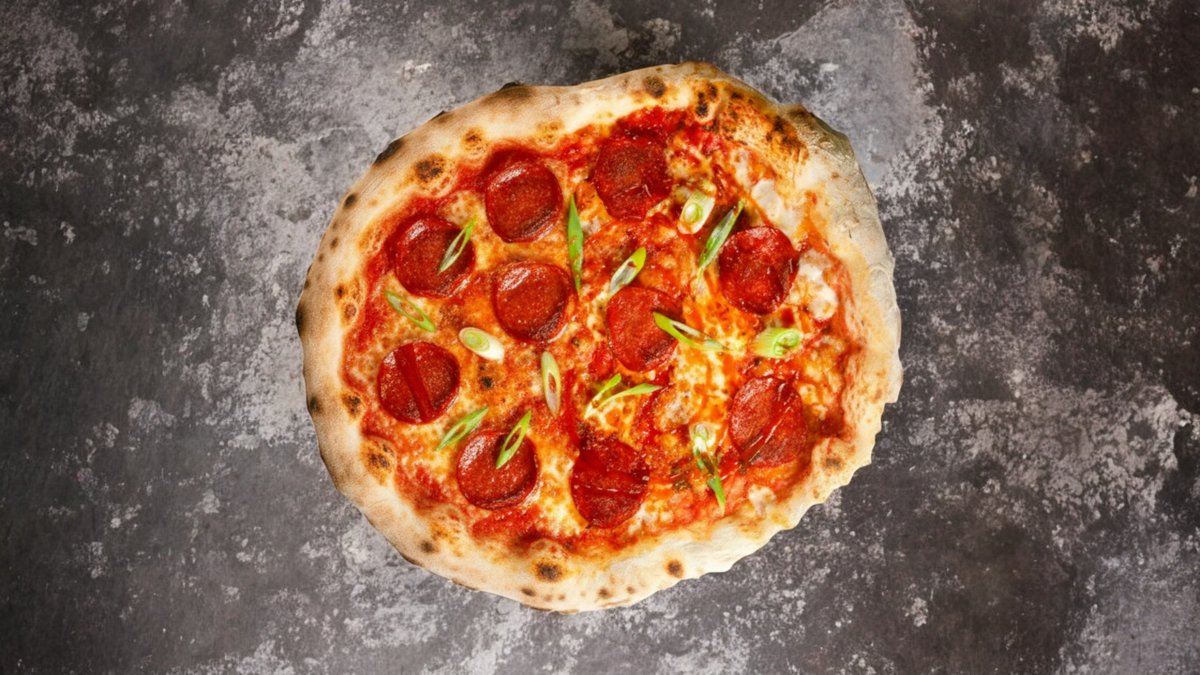 paradicsomos csípős alap, mozzarella, parmezán, újhagymaszár, kolbász