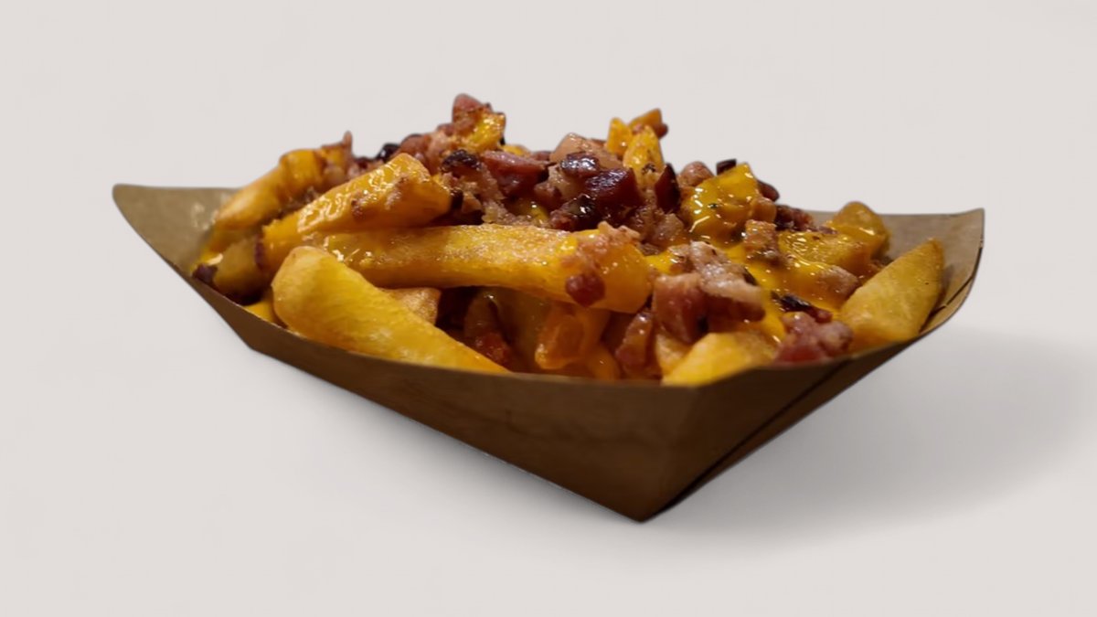 meleg cheddarszósz, sültburgonya, bacon
