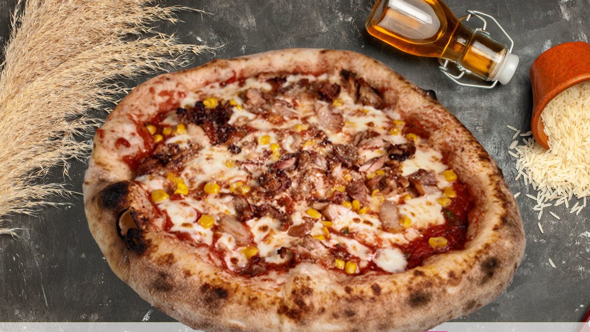 Olasz paradicsomos alap, mozzarella, parmezán, bazsalikom, csirkedarabkák, kukorica