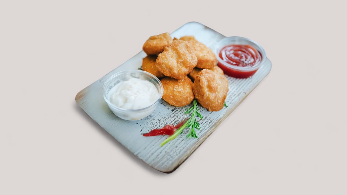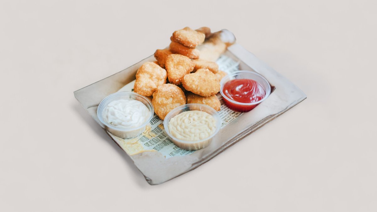 8 darab ropogós csirkenuggets, kívül aranybarna, belül omlós, két ajándék szósz jár mellé!
