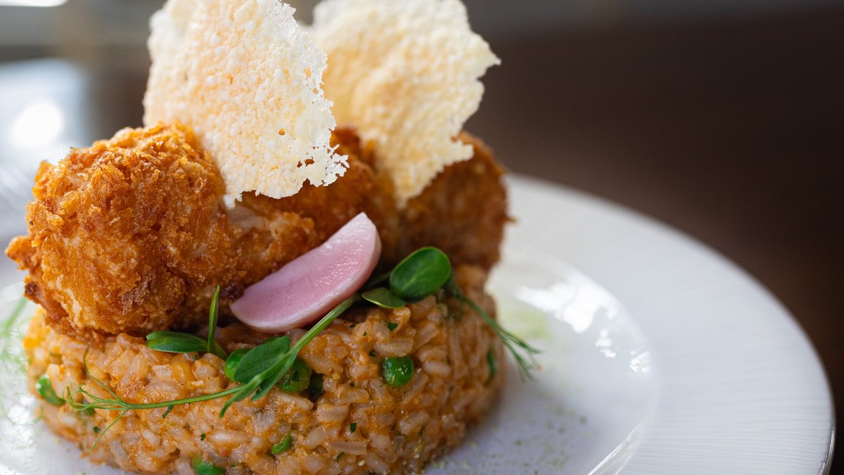 Érlelt sonkával, sajtkrémmel töltött csirkemell bécsi bundában, ruccolás burgonyakrém