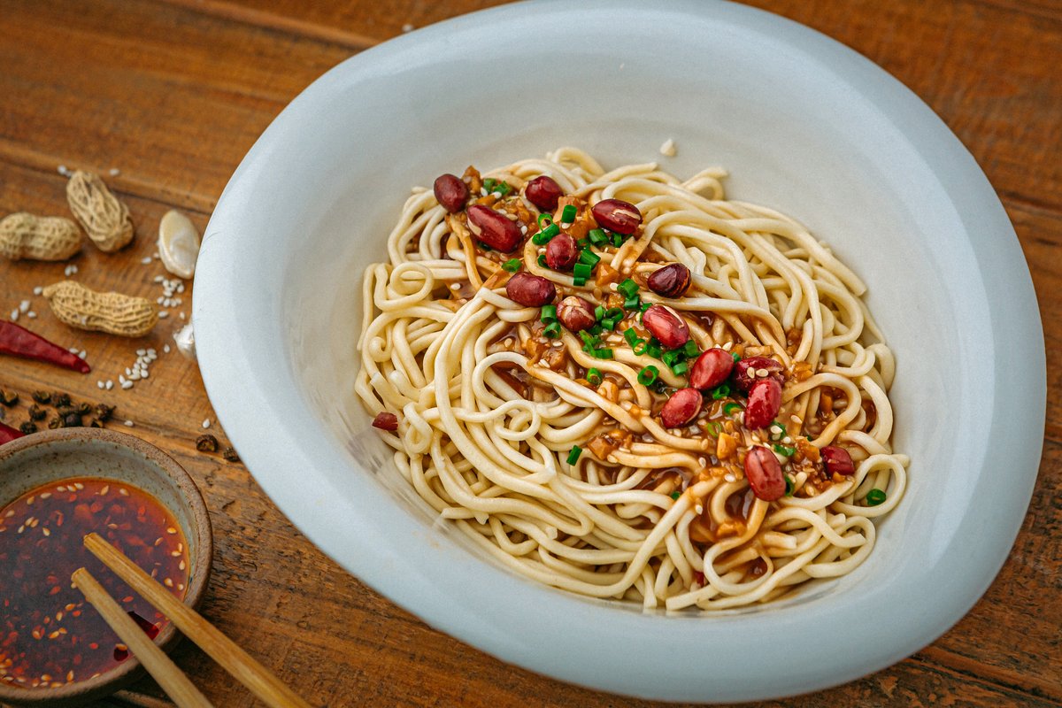 Ez a kifejezetten vegetáriánus vásárlóink számára készült étel földimogyoró, szezámolaj és csipetnyi chili olaj keverékét kínálja. Tésztaágyon élvezték.