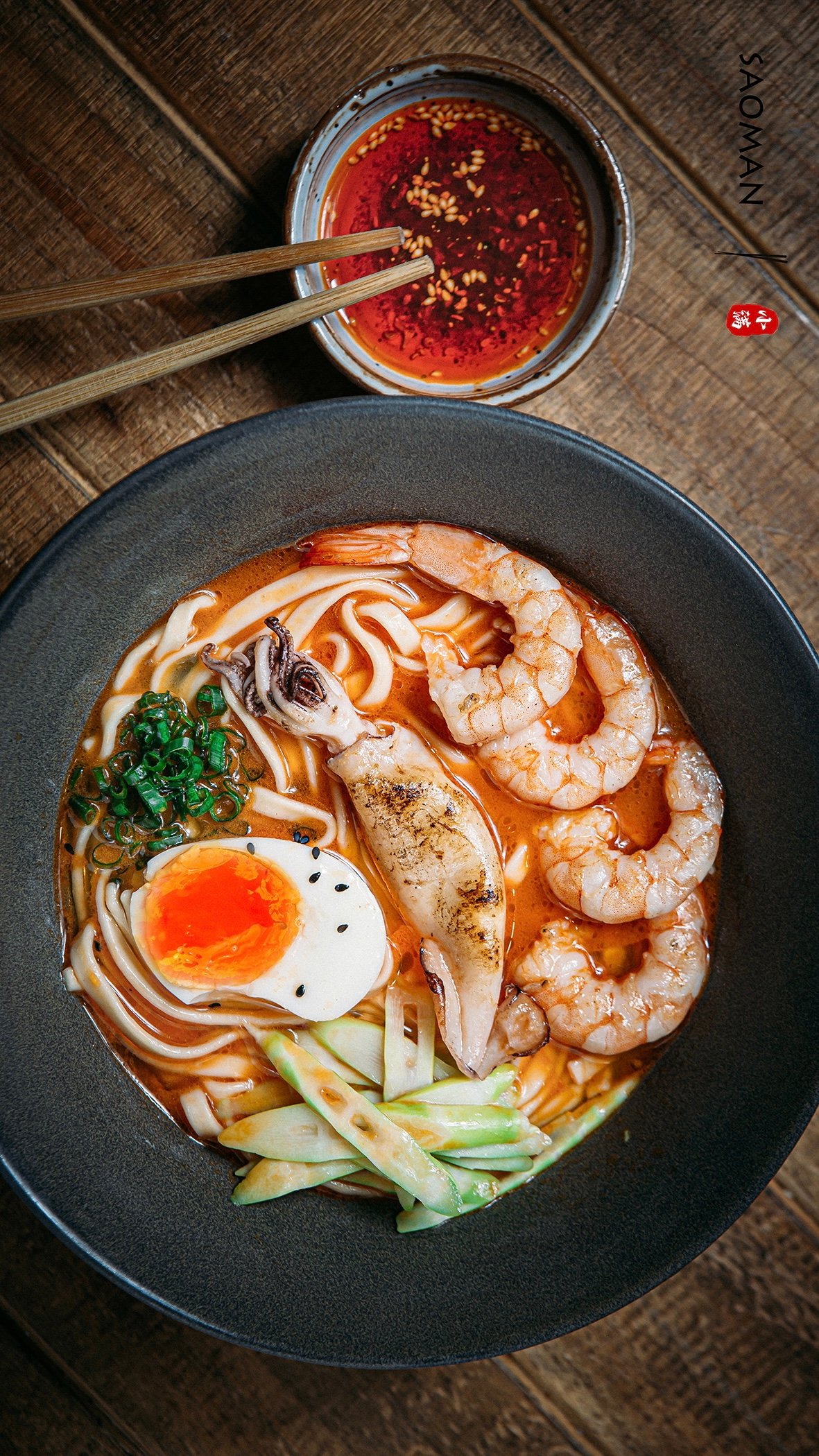 Tapasztalja meg a tenger gyümölcseiből készült tésztalevesünk frissességét. Megrakva különféle tengeri finomságokkal, a garnélaráktól a zsenge tintahalig, mindez egy ízletes, tésztás húslevesben úszik. Tojással, bambuszrügyekkel, zöldhagymával és szezámmaggal tálaljuk.