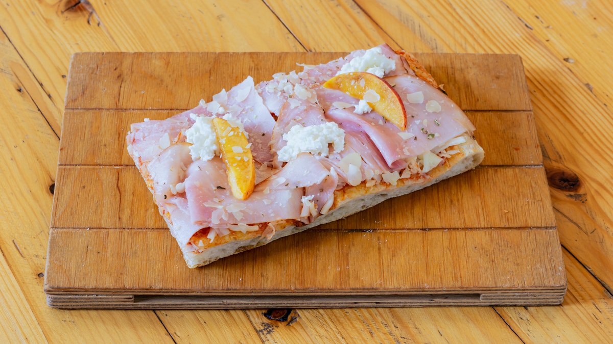 San Marzano paradicsom, mozzarella sajt, gorgonzola sajt, speck sonka, méz