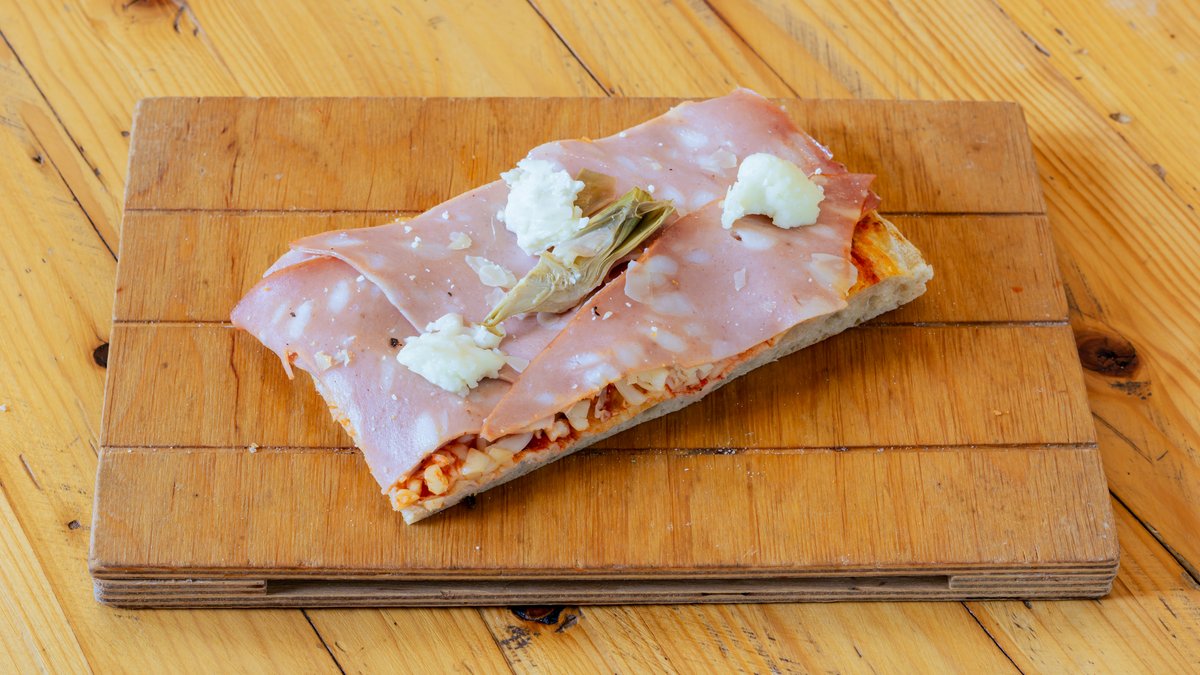 san marzano paradicsom, mozzarella sajt, pisztáciás mortadella, articsóka, mandula, rukkola
