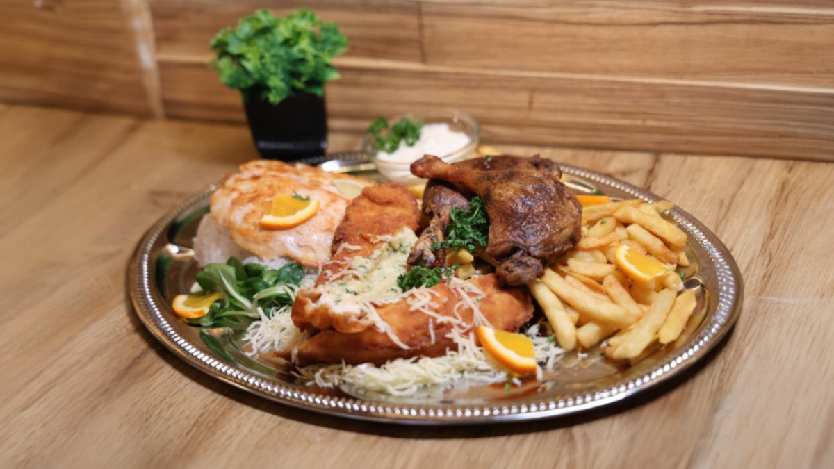 Konfitált kacsacomb, roston sült csirkemell, kijevi csirkemell, vegyes köret, tartármártás