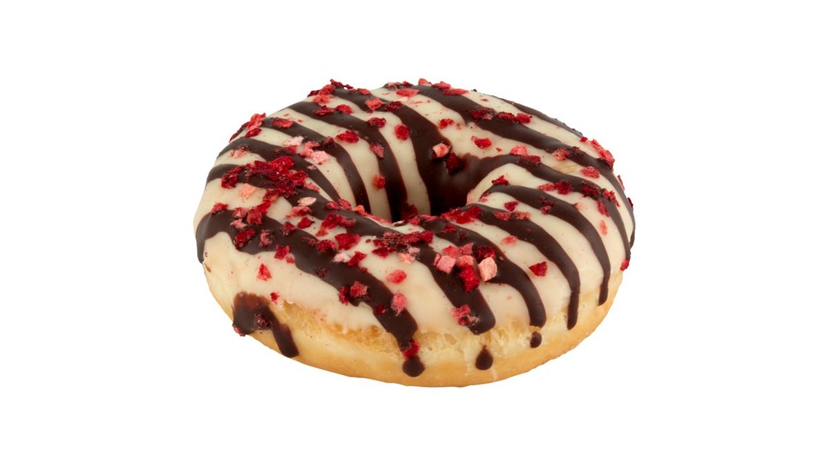 Gyűrűs fánk eper ízű töltelékkel, fehércsokoládés bevonattal, eperdarab szórással, kiolvasztott 73 g