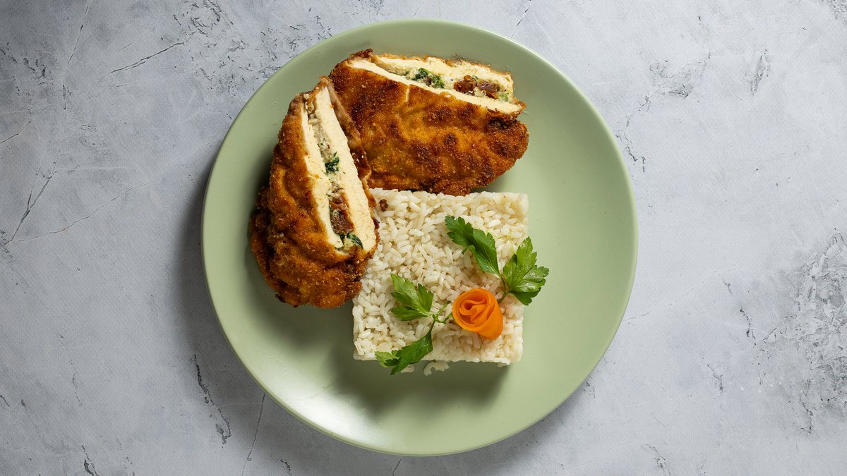 Csirkemell sajttal és sonkával töltve aranyló panírban