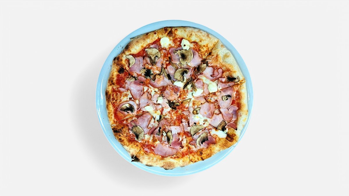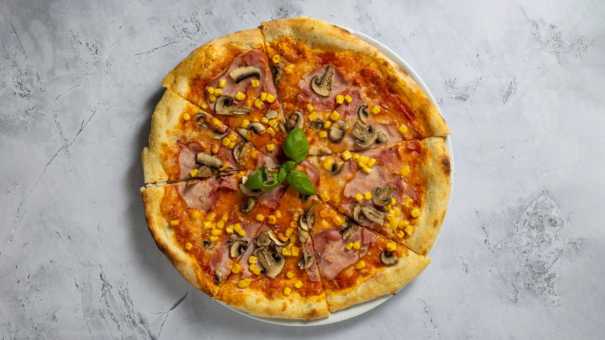 paradicsomszósz, mozzarella, sonka, gomba, kukorica