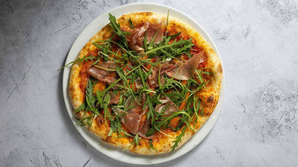 paradicsomszósz, mozzarella, pármal sonka, rukkola
