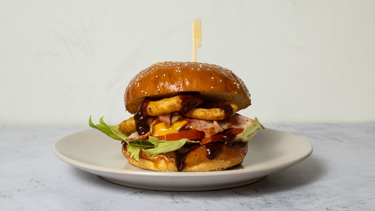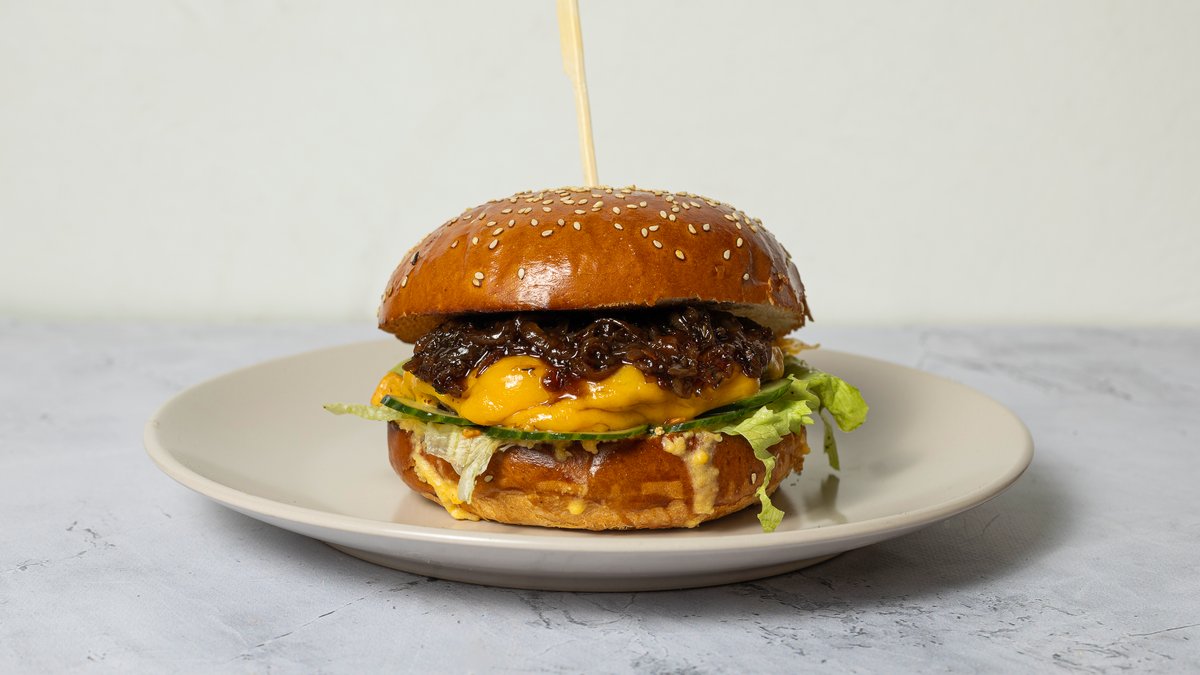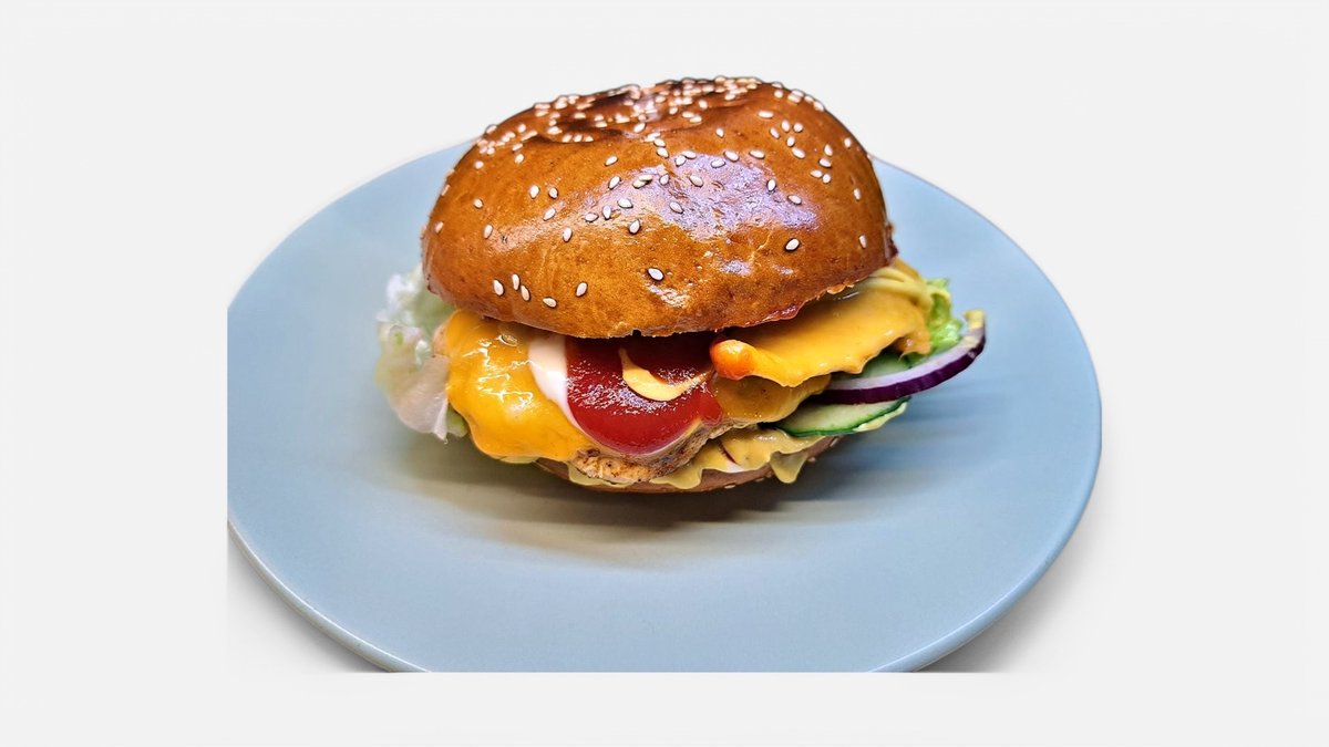 Friss, kovászos, e-mentes buci, 100 % marhahúspogácsa, jcheddar sajt, jégsaláta, uborka, hagyma, paradicsom, szósz cheddar sajt