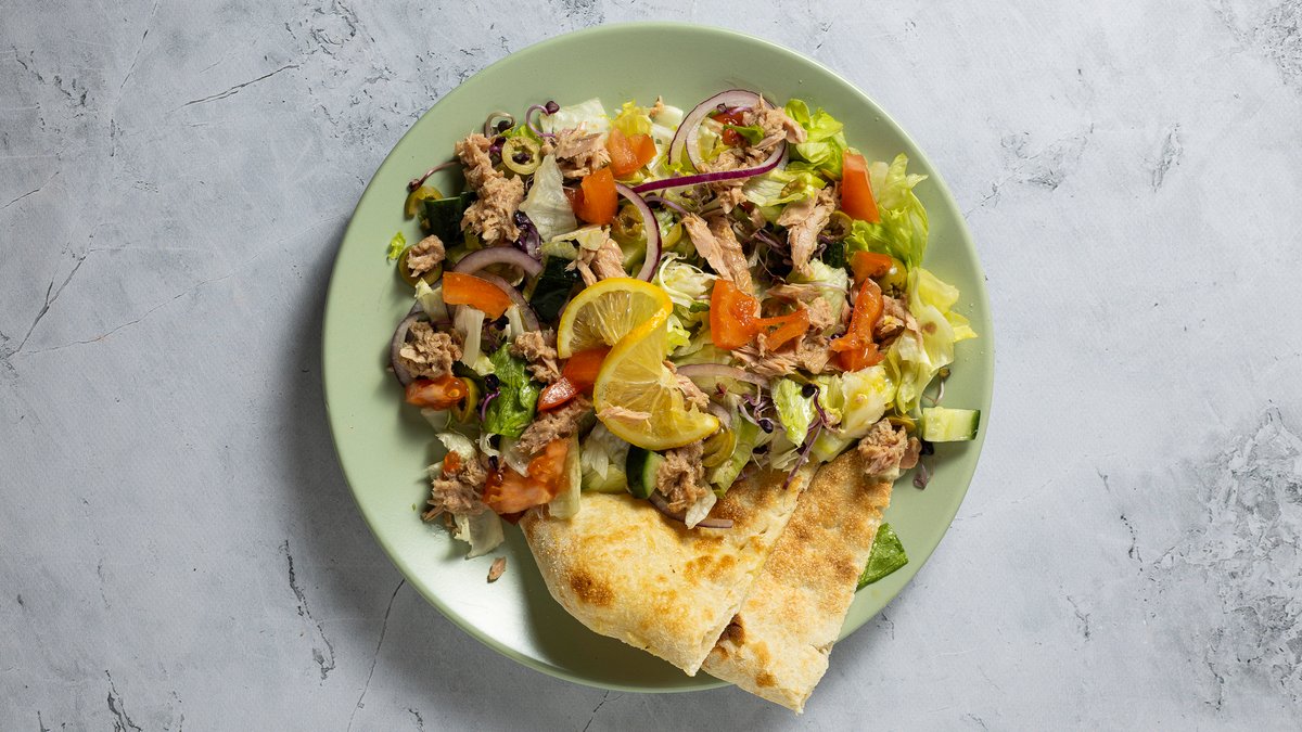Jégsaláta, paradicsom, uborka, tonhal, lilahagyma olívabogyó, vinaegrette öntet
