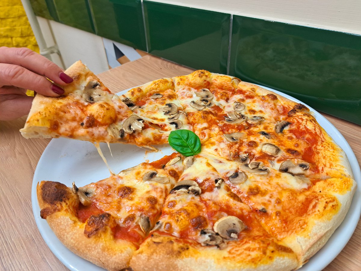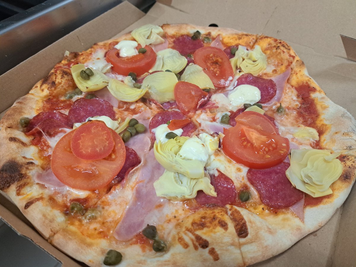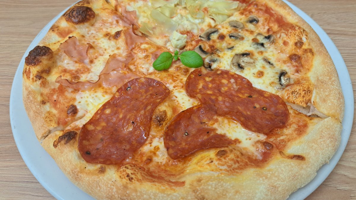 paradicsomszósz, mozzarella, sonka, szalámi, articsóka, gomba