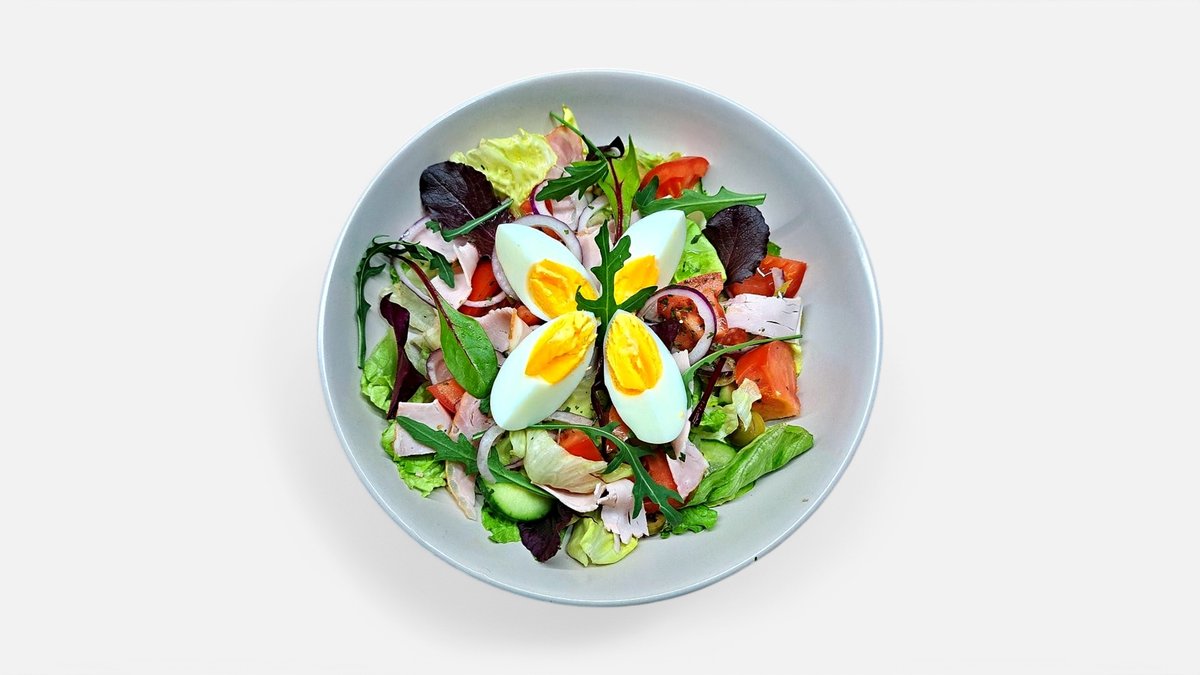 Jégsaláta, paradicsom, uborka, rukkola, sonka, tojás, vinaegrette öntet