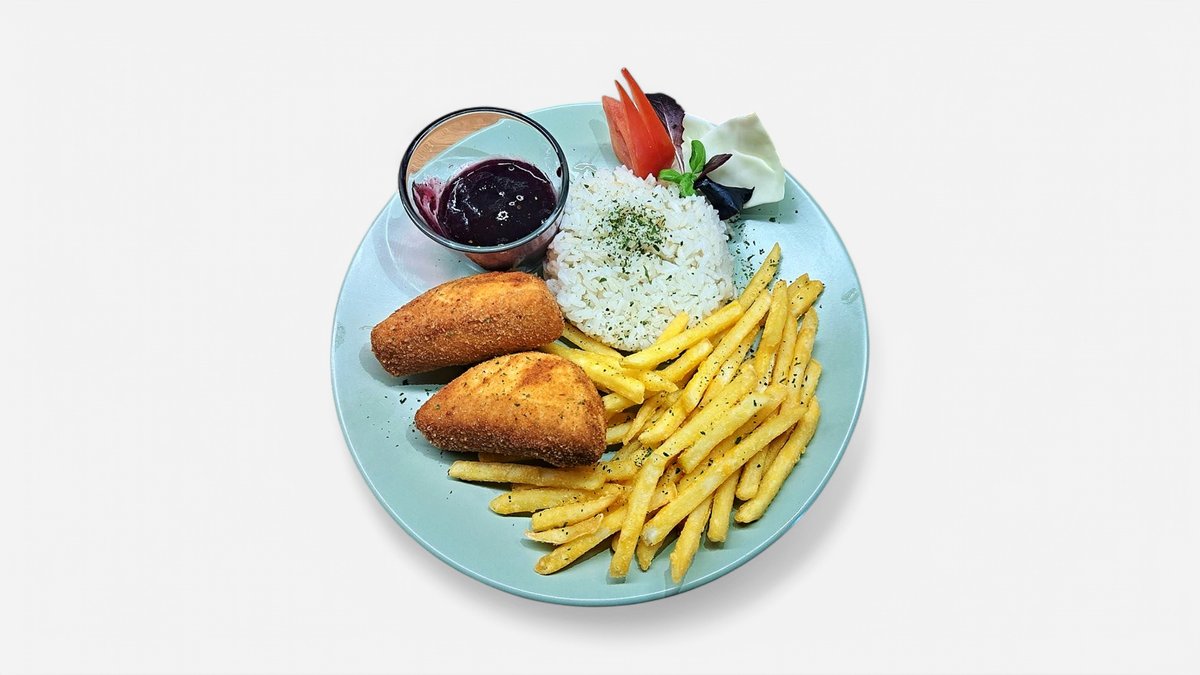 Rántott setésszűz, milánói (paradicsom,sonka, gomba) spaghettivel