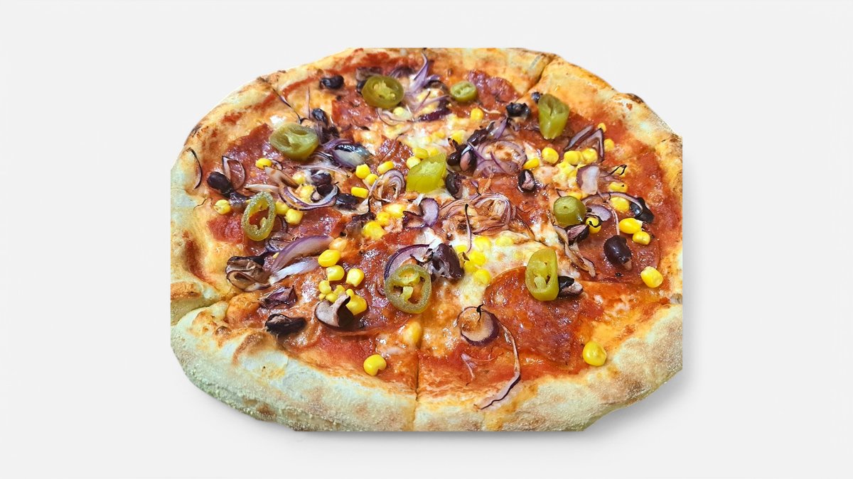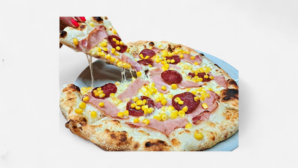 tejfölös alap, mozzarella, sonka, szalámi, kukorica