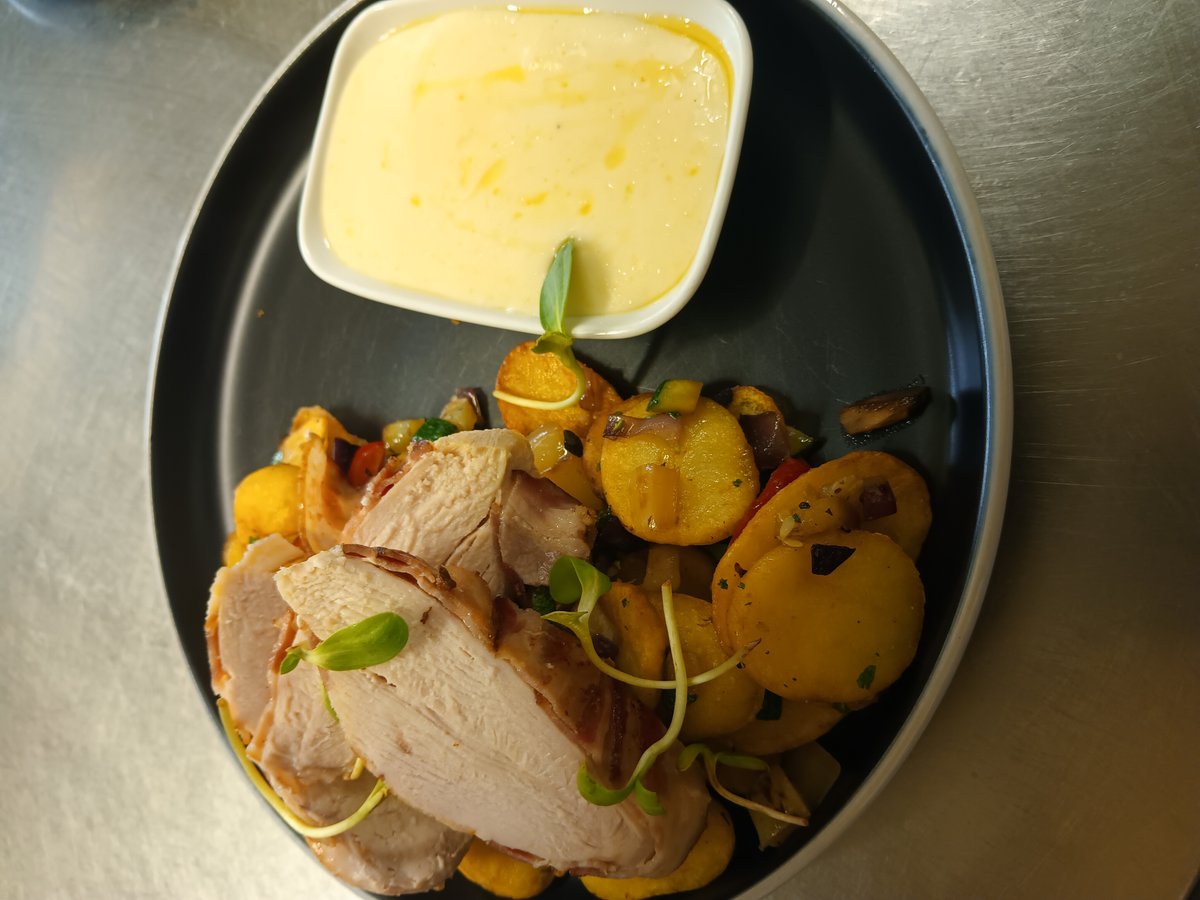 Baconba göngyölt jércemell steak tepsis burgonyával és sajtmártással