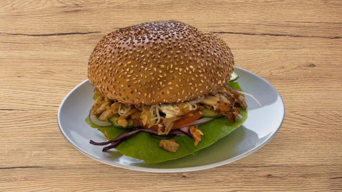 150 g szezámos buci, tejfölös alap, saláta, lila káposzta, lila hagyma uborka, paradicsom, ketchup, majonéz, mustár, házi marhahúspogácsa