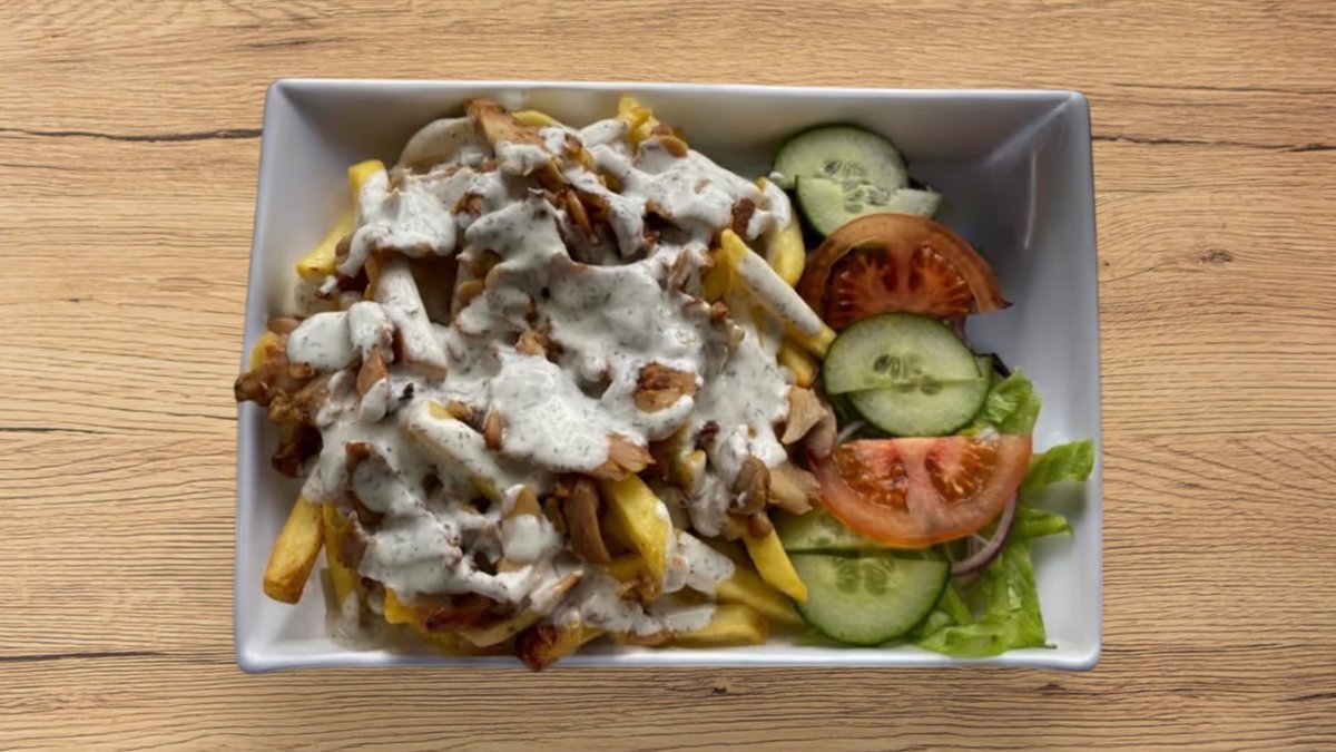 tejfölös alap, saláta, lila káposzta, lila hagyma, kígyó uborka, paradicsom, gyrosszósz, gyroshús