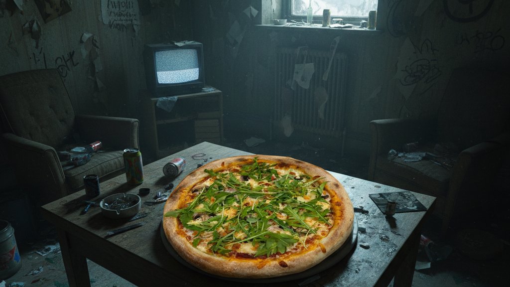 Vékony tészta, paradicsomos alap, szalámi, olivabogyó, mozzarella, rukkola, parmezán