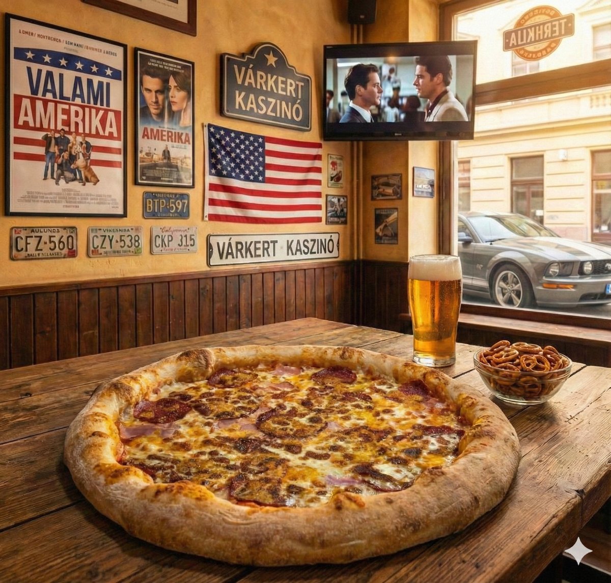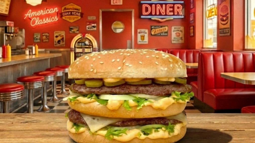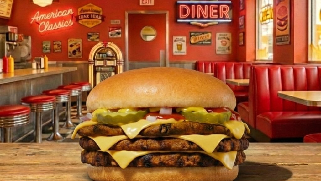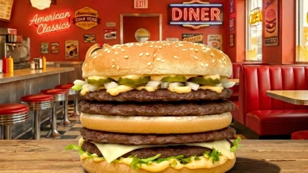 Hamburger zsemle, tripla marha húspogácsa, tripla cheddar sajtszelet, ketchup, mustár, friss vöröshagyma, szeletelt csemegeuborka