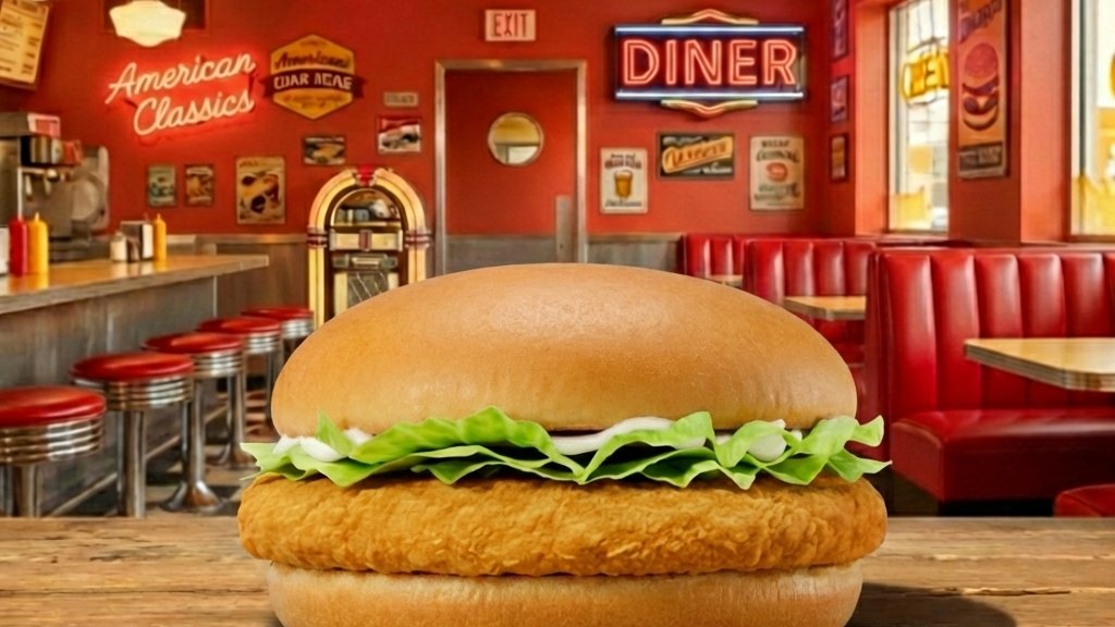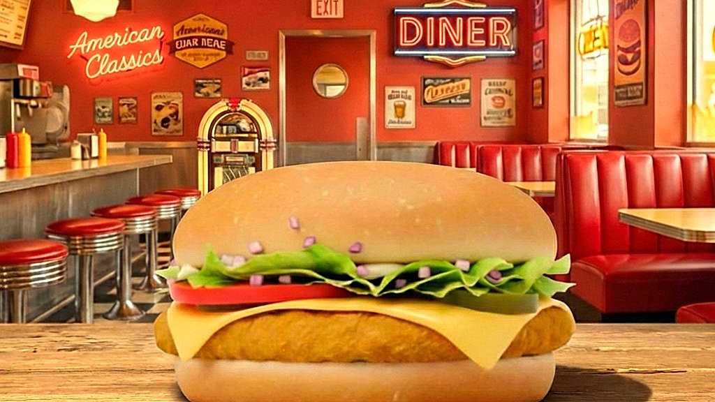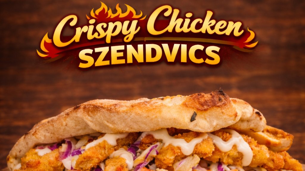 Háromba vágott hamburger zsemle, dupla csirkehúspogácsa, cheddar sajtszelet, hamburger szósz, friss vöröshagyma, jégsaláta, szeletelt csemegeuborka