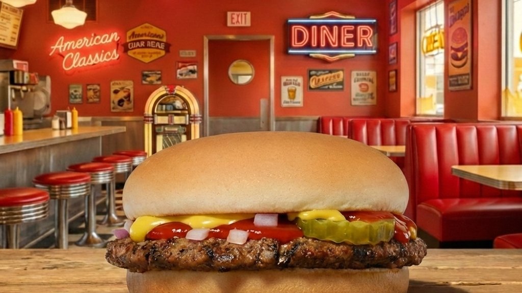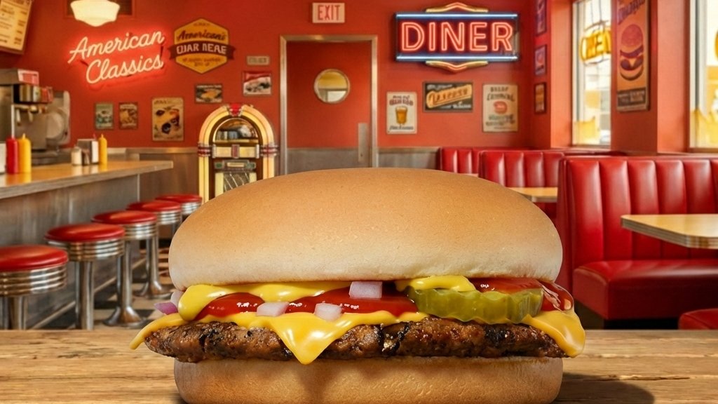 Hamburger zsemle, marha húspogácsa, cheddar sajtszelet, ketchup, mustár, friss vöröshagyma, szeletelt csemegeuborka