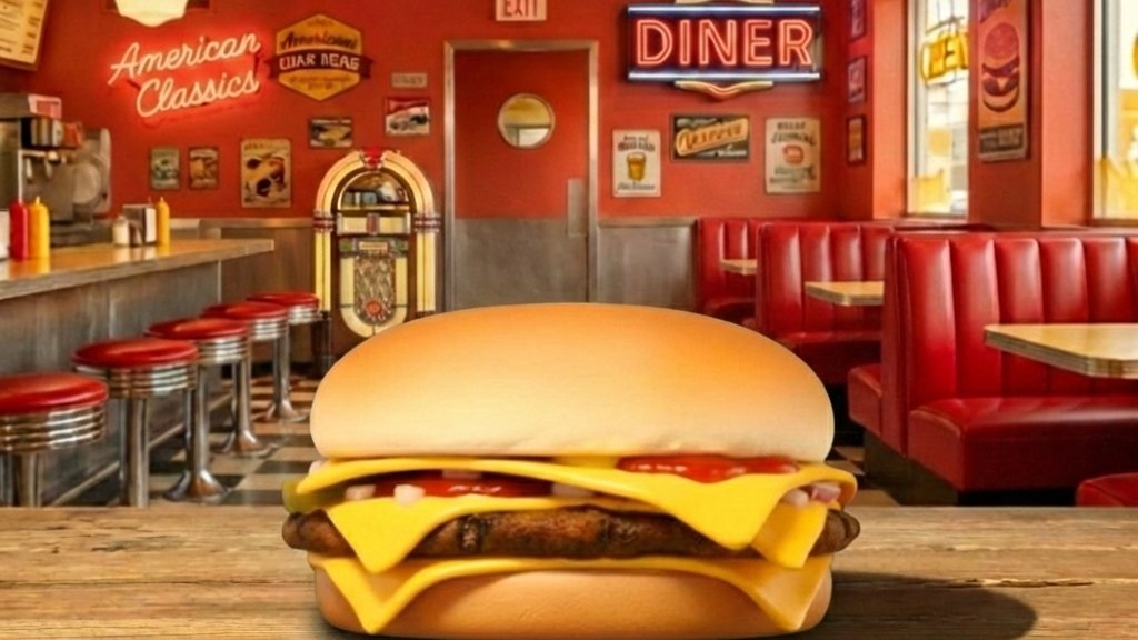 Hamburger zsemle, dupla marha húspogácsa, dupla cheddar sajtszelet, ketchup, mustár, friss vöröshagyma, szeletelt csemegeuborka