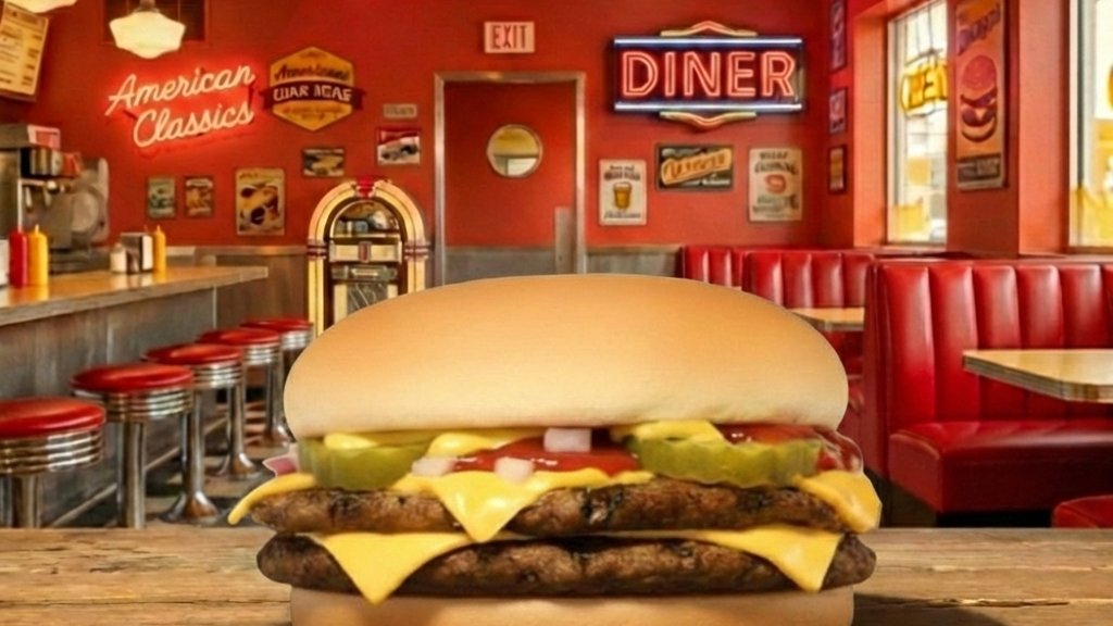 Háromba vágott hamburger zsemle, dupla marha húspogácsa, cheddar sajtszelet, hamburger szósz, friss vöröshagyma, jégsaláta, szeletelt csemegeuborka
