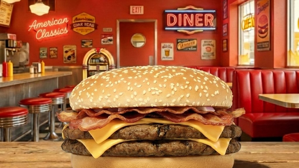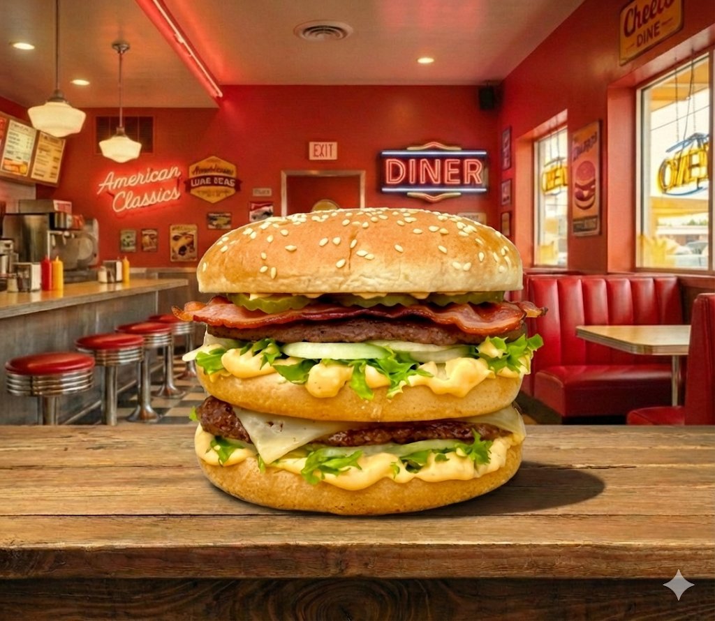Háromba vágott hamburger zsemle, dupla marha húspogácsa, cheddar sajtszelet, 2 szelet bacon, hamburger szósz, friss vöröshagyma, jégsaláta, szeletelt csemegeuborka