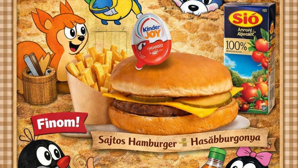 Sajtburger / Chicken burger / Hamburger / 4db Chicken MagNuggets hasábburgonya Kinder JOY SIÓ almalé 0,2l