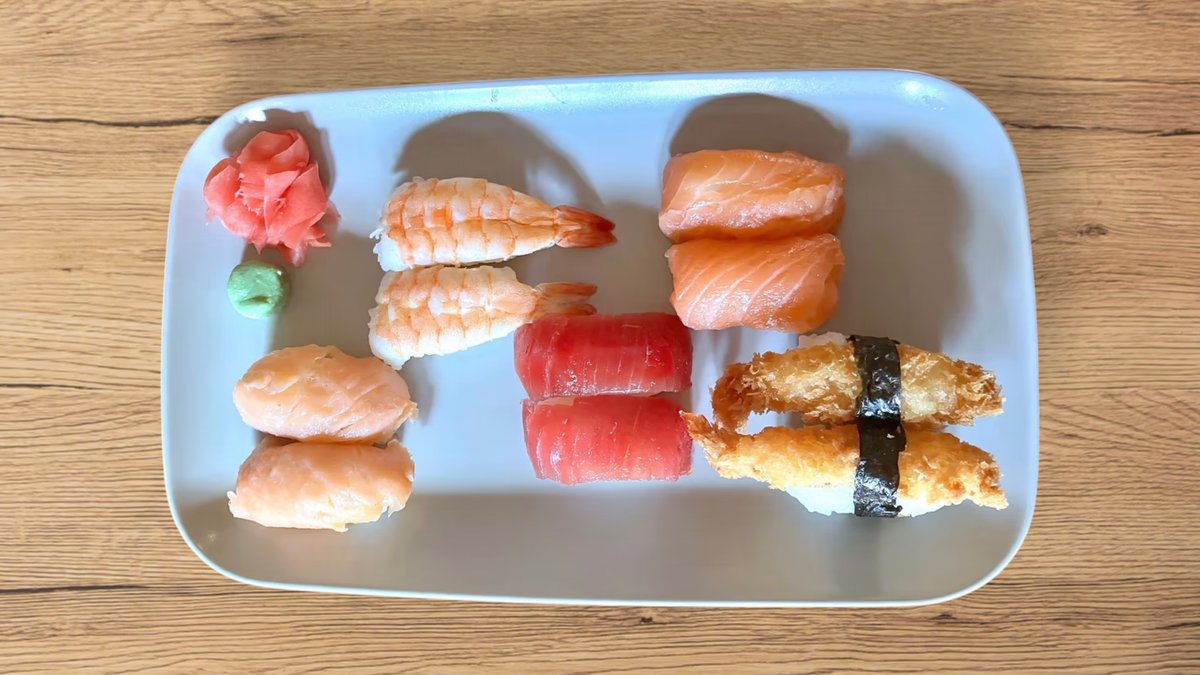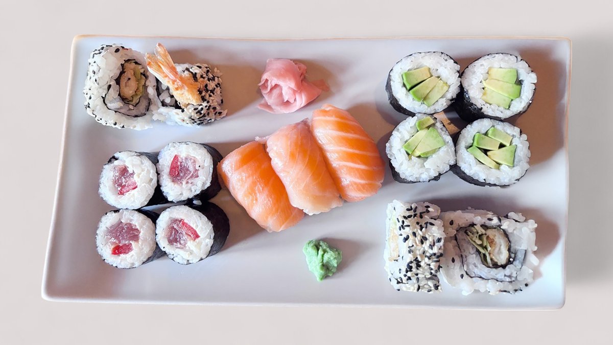 4 db füstölt lazac XL maki, 4 db Prawnie (garnéla, avokádó, pikáns házi szósz), 4 db Red Santa (vörös tonhal, kalifornia paprika, mungóbab csíra, édes chiliszósz, pirított szezámmag), 1 db lazac nigiri, 1 db garnéla nigiri, 1 db füstölt lazac nigiri
