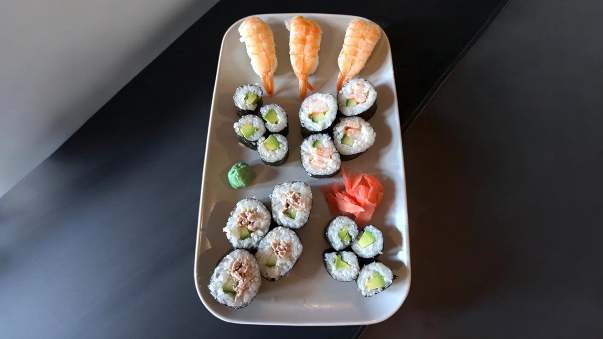 8 db Garnéla kismaki 4 db Lasa (lazac, avokádó, sajtkrém) 4 db Kwack (pirított kacsamell, teriyaki, újhagyma) 1 db Avokádó, 1 db Lazac, 1 db Surimi nigiri