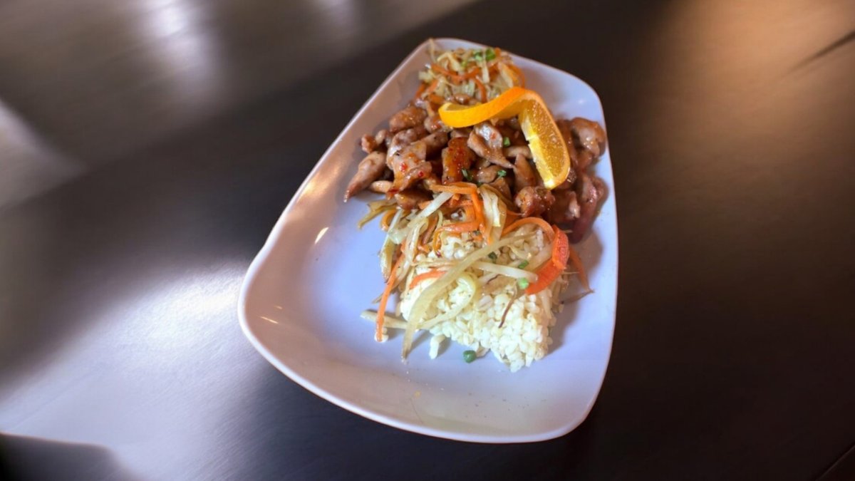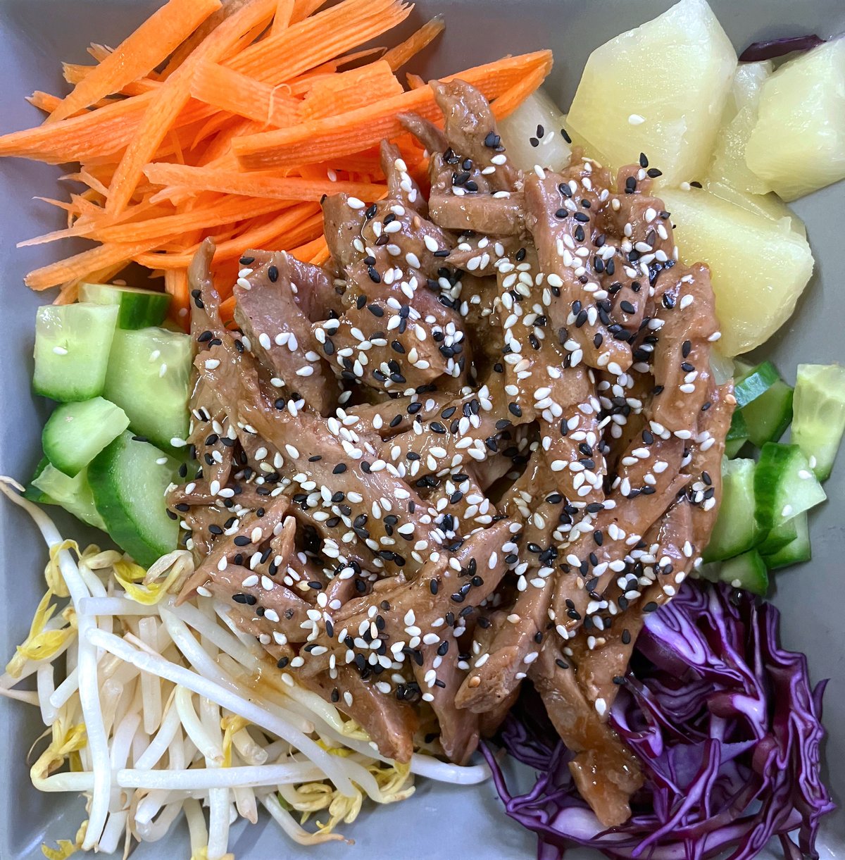 sushi rizs, teriyaki kacsamell, ananász, babcsíra, répa, uborka, lila káposzta, pirított szezám