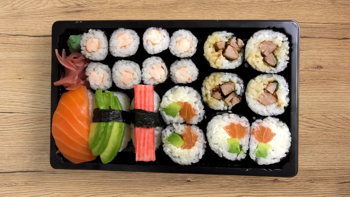 2db Uborka XL maki, 2db Bundázott rák maki, 2db Kwack maki (pirított kacsamell, teriyaki, újhagyma), 1db Lazac nigiri, 1 db Füstölt Lazac nigiri