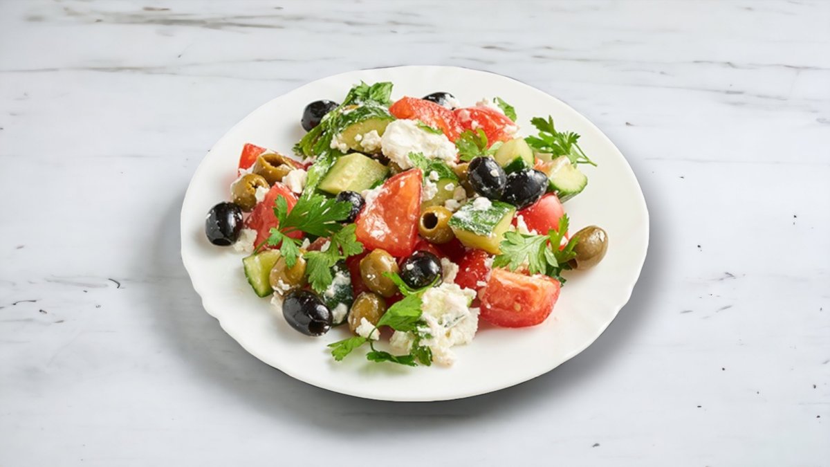 Falafel, saláta, hagyma, paradicsom, uborka, hamburgerszósz