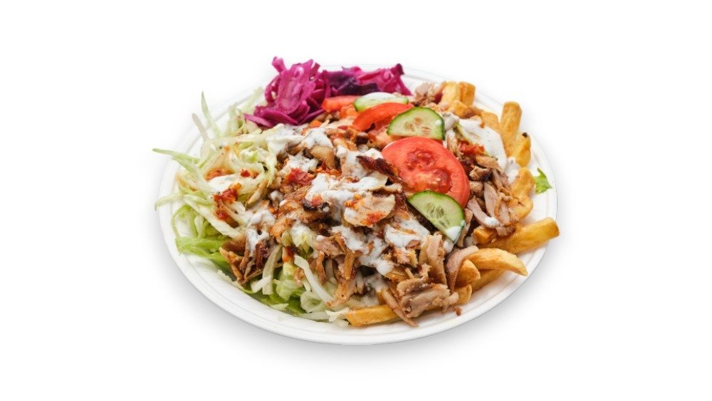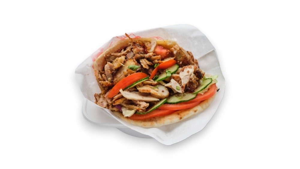 gyros alap, hagyma, káposzta, gyroshús, paradicsom, uborka, csípős gyros öntet, sajt