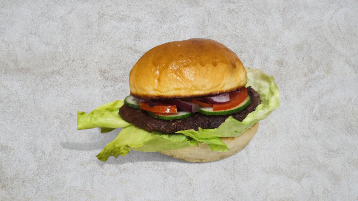 Marhahúspogácsa (2db), saláta, hagyma, paradicsom, uborka, hamburgerszósz