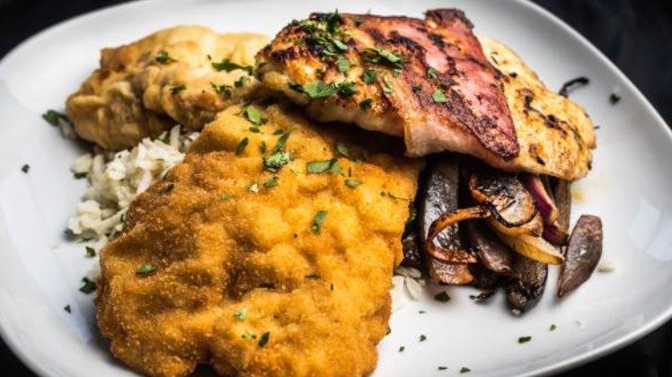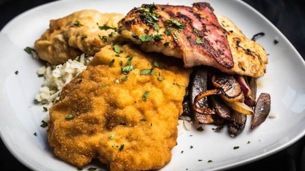 roston sült csirkemell baconbe göngyölve (2 db), rántott csirkemell (2 db), csirkemell párizsi bundában (2 db), grill zöldség, rizs