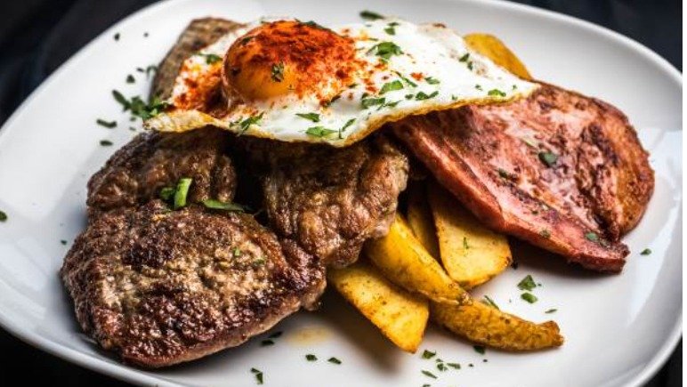 pácolt tarja (1 db), sült szalonna (1 db), tükörtojás, roston sült fűszeres karaj, steakburgonya