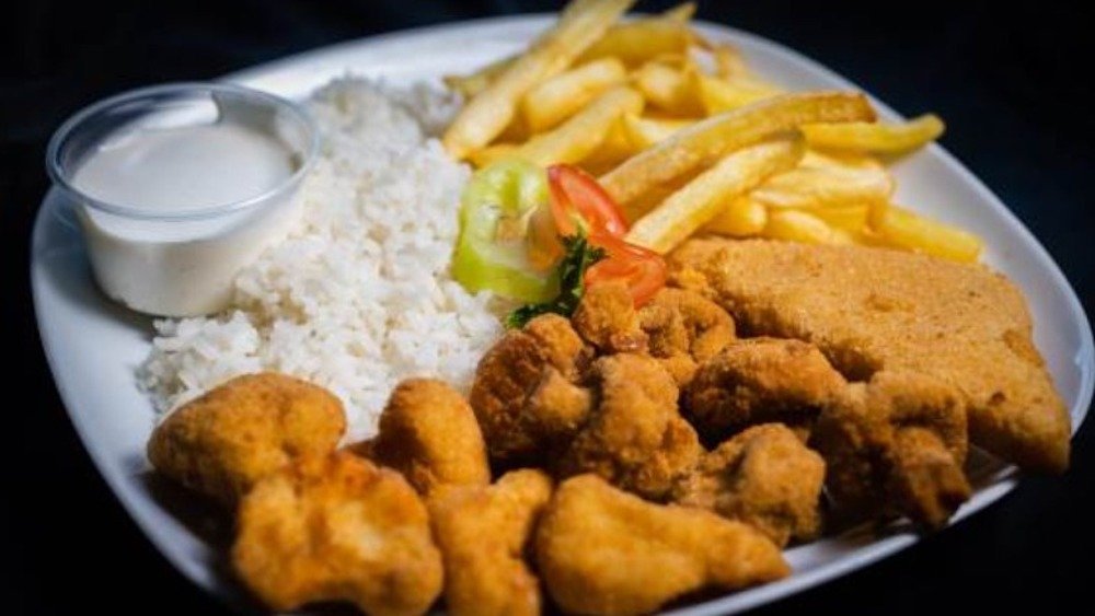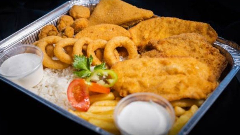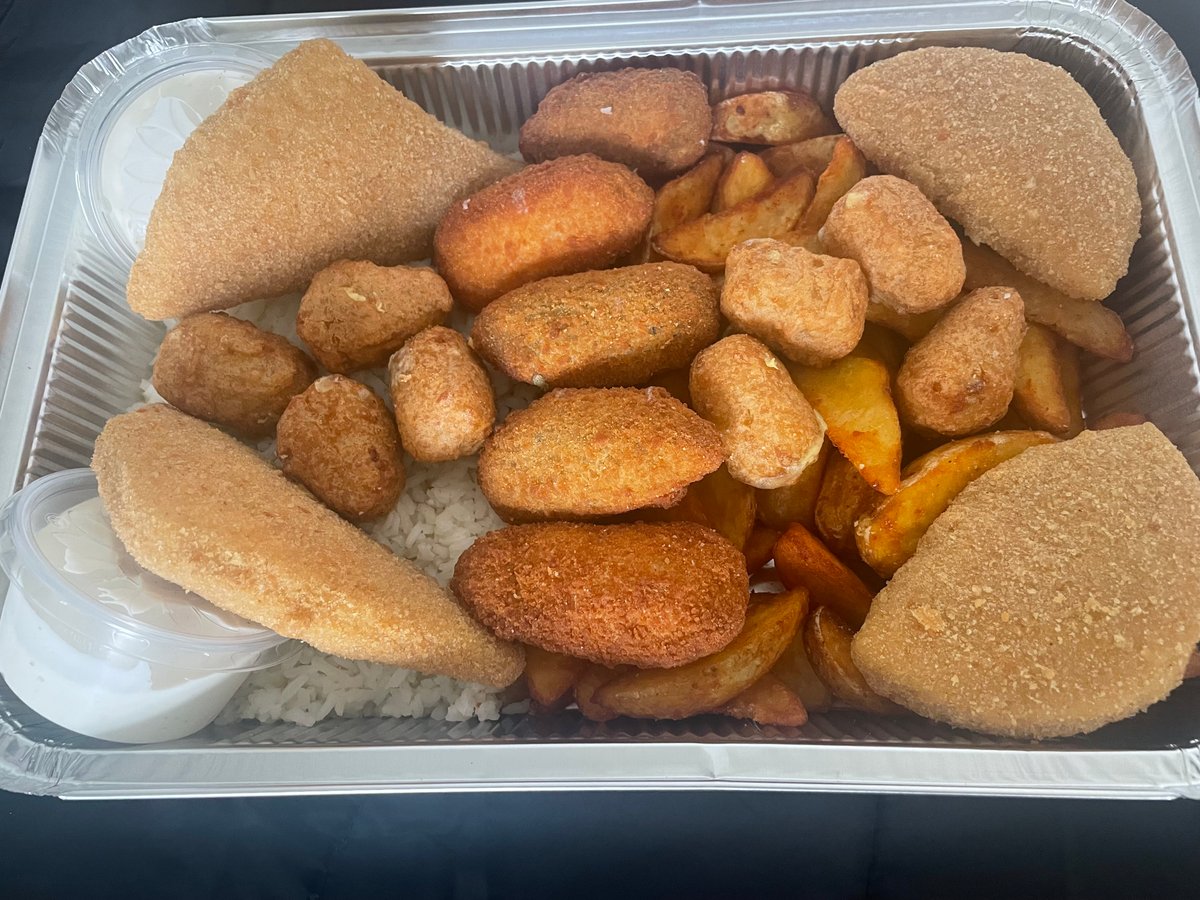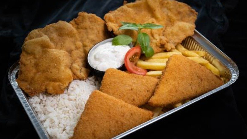 rántott csirkemell (2 db), rántott sertéskaraj (1 db), rántott gomba (4 db), rántott trappista sajt (1db), rántott camembert sajt (1 db), rántott hagymakarika (6 db), 2,5 adag vegyes köret (hasábburgonya, rizs), 2 adag tartármártás