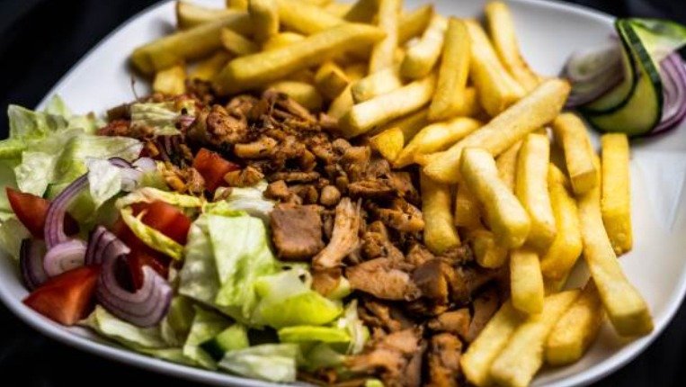 csirkecomb, jégsaláta, paradicsom, uborka, lilahagyma, hasábburgonya (Kérlek, válassz öntetet!)