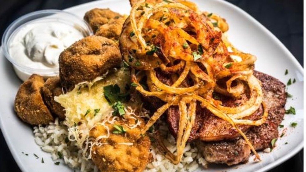 2 db rántott csirkemell, 2 db rántott sertéskaraj, 2 db pácolt tarja, 4 db rántott gomba, 1 db rántott trappista sajt, 1 db rántott camembert sajt, 6 db rántott hagymakarika, rizibizi, steakburgonya, tartármártás