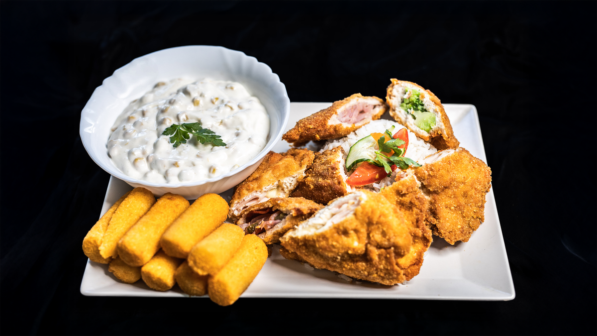2 db Cordon bleu csirkemellből, 2 db zengővárkonyi sertéskaraj, 2 db töltött sertéskaraj, 2 db füstölt sajttal-brokkolival töltött csirkemell rántva, rizs, burgonyakrokett, majonézes kukoricasaláta