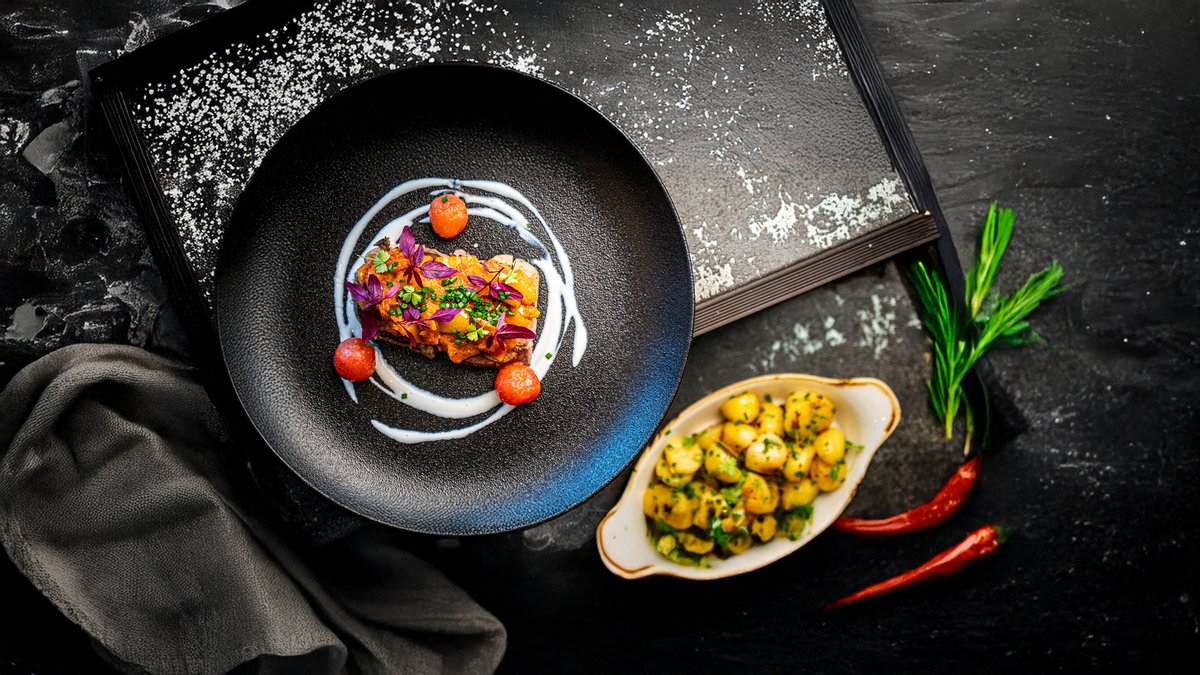 Fogasfilé, hosszú bab, sült édesburgonyapüré, savanyított gyöngyhagyma