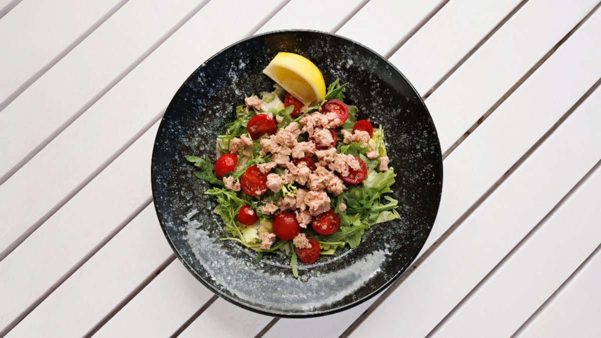 jégsaláta, paradicsom, rukkola, öntet, tonhal