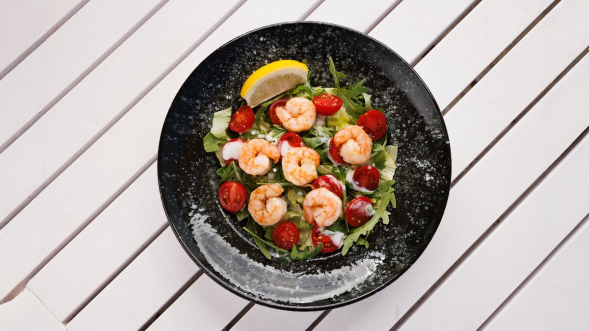 jégsaláta, paradicsom, rukkolam öntet, garnéla