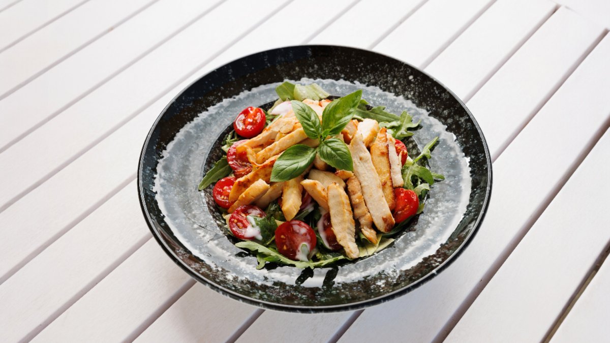 jégsaláta, paradicsom, rukkola, öntet, roston sült csirkemell csíkok