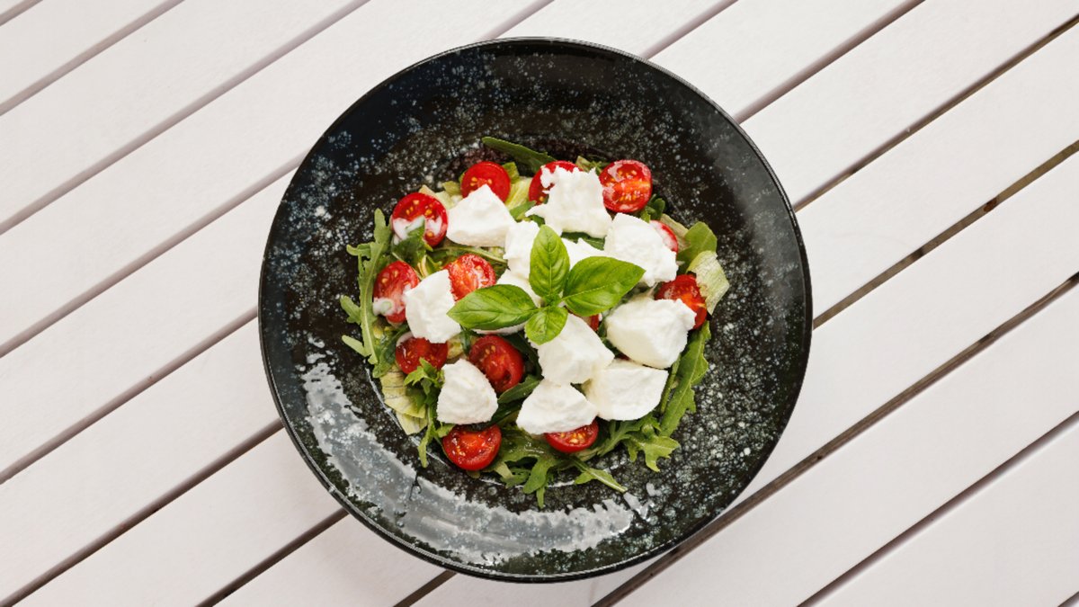 jégsaláta, paradicsom, rukkola, öntet, mozzarella