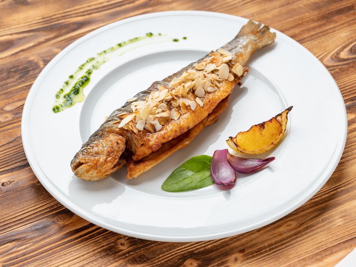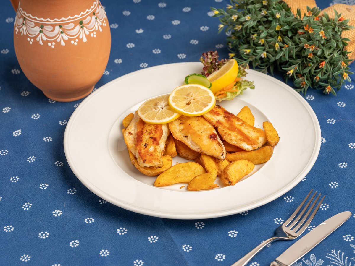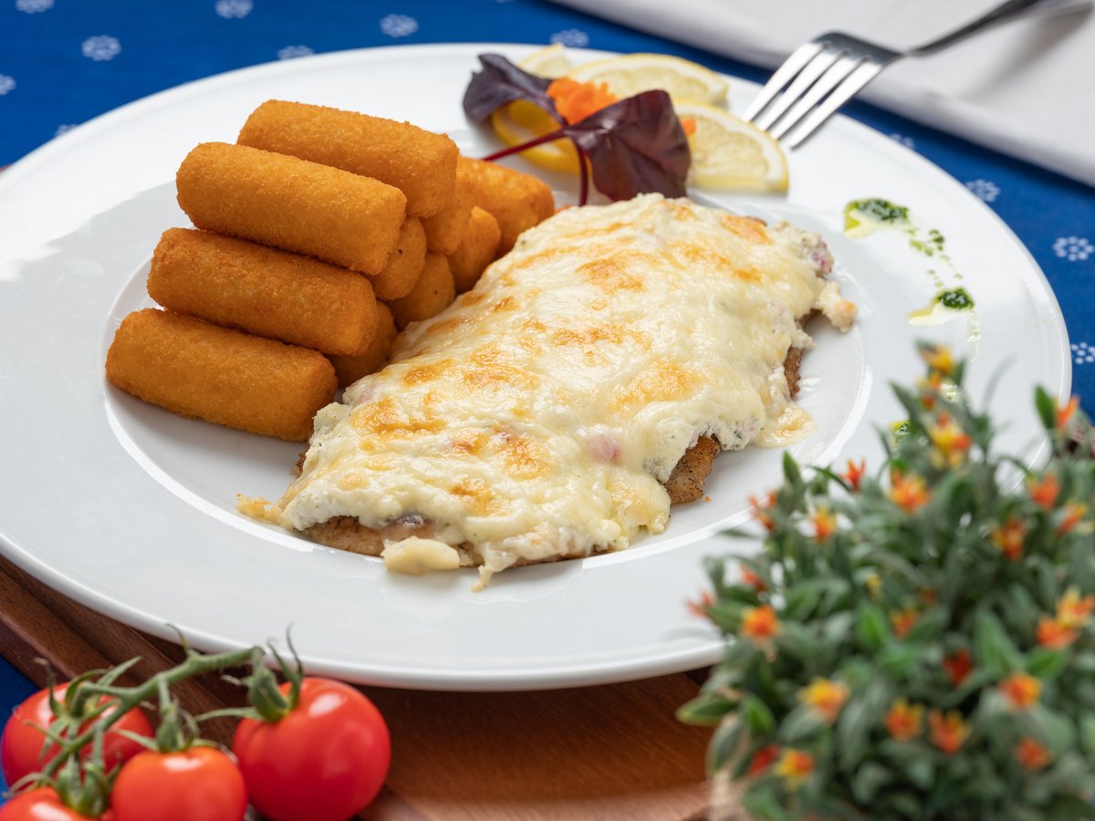 (egyszemélyes) harcsa Cordon Bleu, pontyfilé roston, süllő „szögediesen”, /Köretet nem tartalmaz./